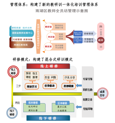 基于湖南省教师全员工作坊研修的经验,我区首创“区域全员教研训一体混合式”教师专业成长模式,创新“全员参与、双线管理、主题研修、常态管理”的教研训流程,培养“团队共进互教互学、主动参与、自主管理”的研训文化,从而构建起“教研训一体”的区域研训机制。