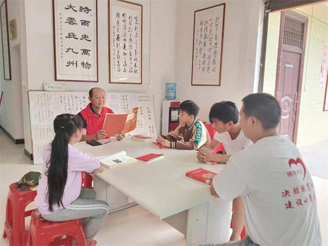 这是7月8日,新晃侗族自治县扶罗镇原三江村中医药文化传承五老工作室负责人杨金桐老医生在留守儿童义务托管班上跟孩子们讲授中医药传承课的一个场景。
