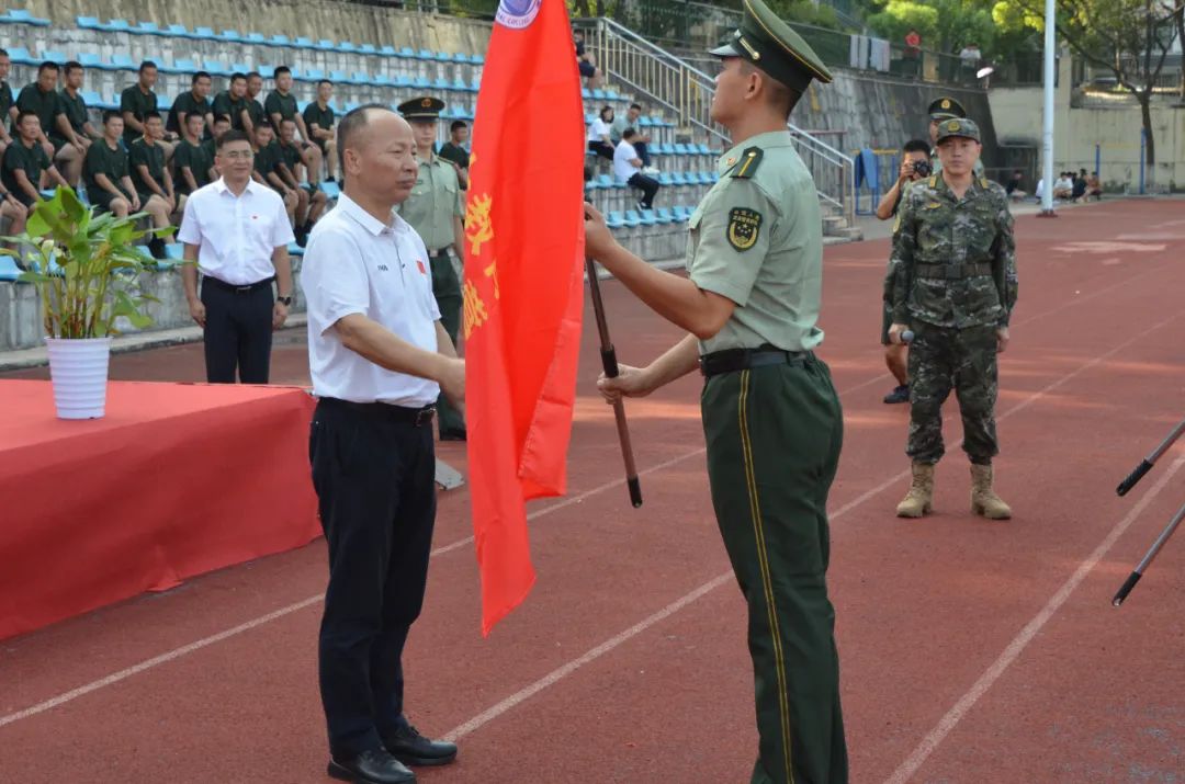 在庄严的国歌声中,大会正式开始。党委副书记、院长罗器宇,党委副书记、副院长彭庆文为新生军训团、营授旗。