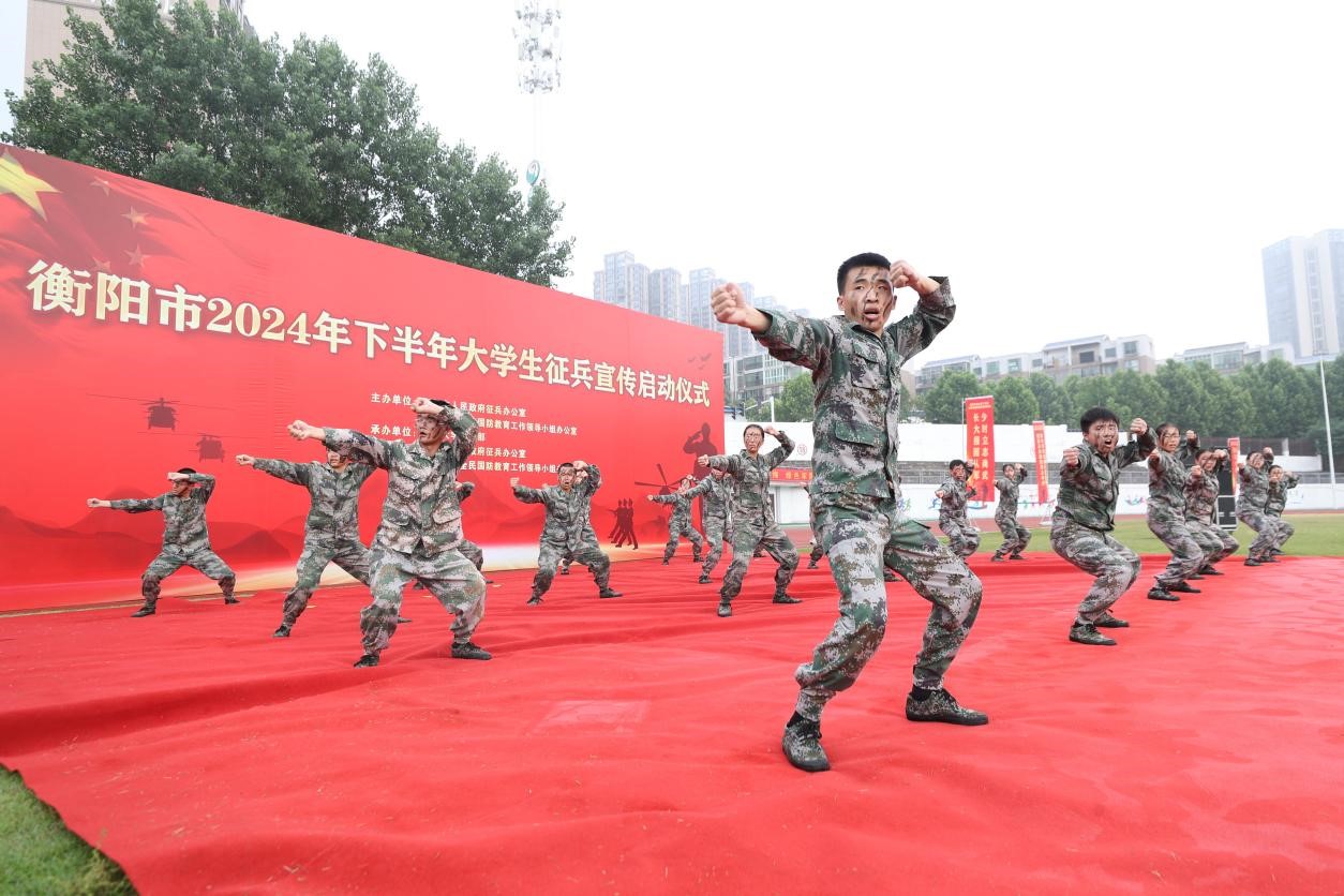军地领导为优秀退役大学生士兵代表颁发征兵宣传形象大使聘书并合影留念。衡阳市征兵宣传形象大使、南华大学退役大学生士兵李硕分享了军旅感悟,号召广大有志青年加入军营。应征大学生代表、南华大学蒋远健同学现场宣读倡议书,号召响应祖国召唤,接受祖国挑选,踊跃应征。来自南华大学、衡阳师范学院的同学们还为大家现场表演了匕首操、军歌合唱、格斗操等精彩节目,充分展现了青年大学生顽强向上的良好风貌,点燃了广大学子强军报国的激情。