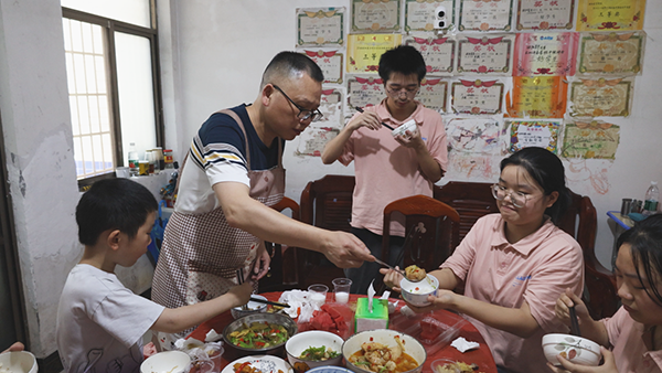 随着饭菜上桌,欧阳晓的学生们也陆续来到家中,与老师一家一起享用这顿丰盛的晚餐。饭桌上,欧阳晓一边给学生夹菜,一边询问大家最近的学习状态。他一改往日课堂上严厉的作风,像位知心大哥哥一样与大家交流谈心,为大家排解焦虑情绪,鼓励学生们以乐观的心态迎接考试。