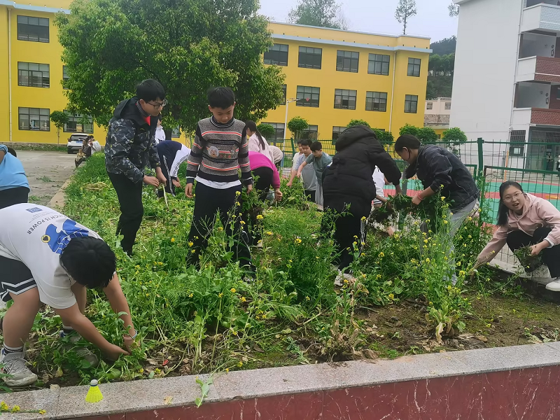 学校把学生宿舍楼前的空地划分成师生劳动实践基地,将劳动实践基地划分成12块劳动基地,让全校各班承担劳动基地的建设,全体师生共同参与除草、平地、耕种等劳动。此外,学校利用卫生大扫除活动组织学生进行卫生打扫,创设良好氛围,使劳动教育常态化,形成劳动教育合力。