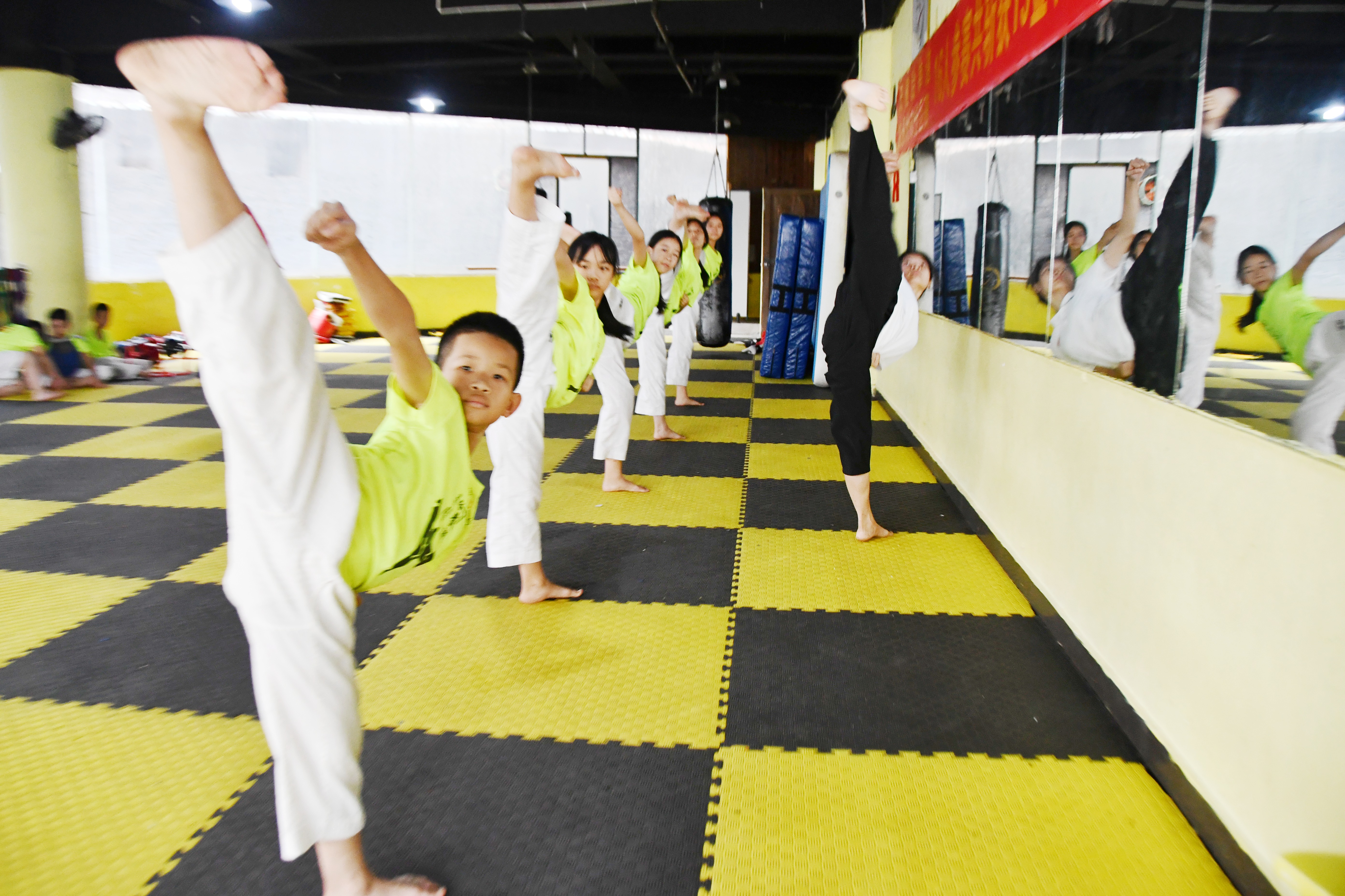 7月23日,小学生在江永县一家跆拳道培训机构练习跆拳道。