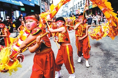 ④湖南省湘西州泸溪县浦市第一幼儿园孩子在舞龙。