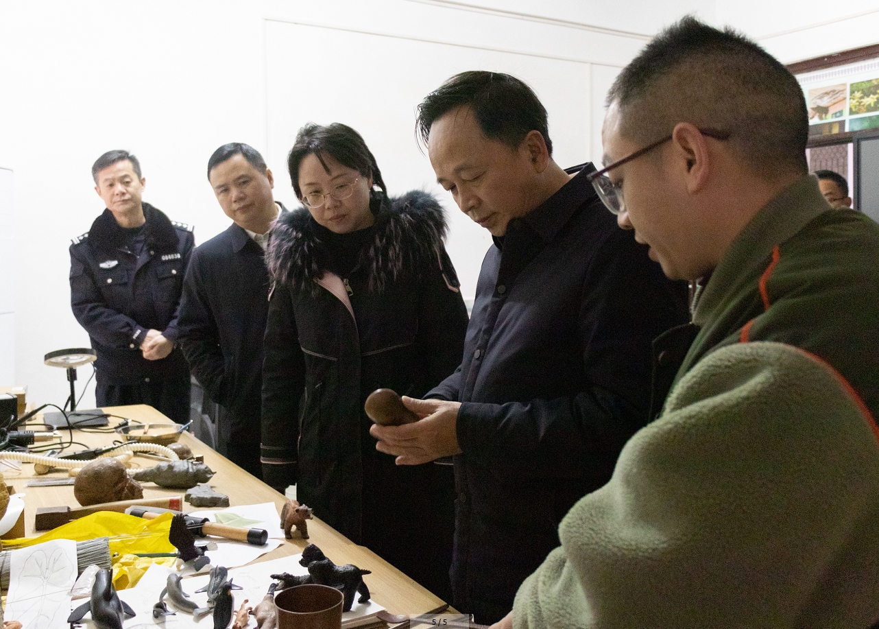 田刚县长一行参观考察了侗族传统工艺传承研习基地、工艺美术大师工作室、陶瓷艺术工作室等多个民族特色工作室等。通道职中教师、怀化市首届“五溪工匠”王淋向调研组就研习基地、工作室建设情况,以及非遗文化保护、传承和发展工作进行细致的讲解。
