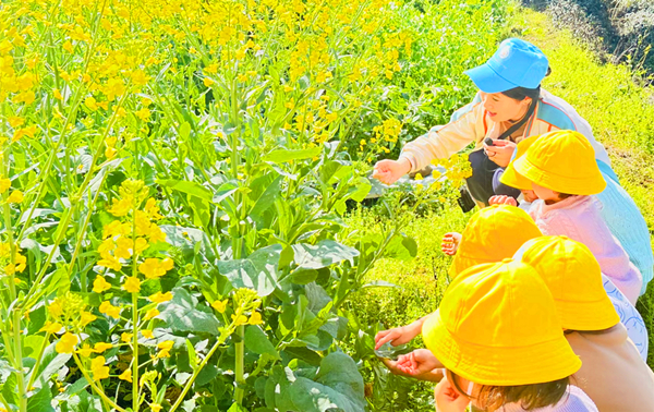 “油菜花好漂亮……”活动中,幼儿们走进油菜花田,兴奋地穿梭在花海中,近距离观察油菜花的形态和颜色,领略大自然的神奇与美妙,感受到春天的多彩和阳光的温暖。金灿灿的油菜花、嗡嗡飞舞的小蜜蜂、清新透绿的田野深深吸引着大家。