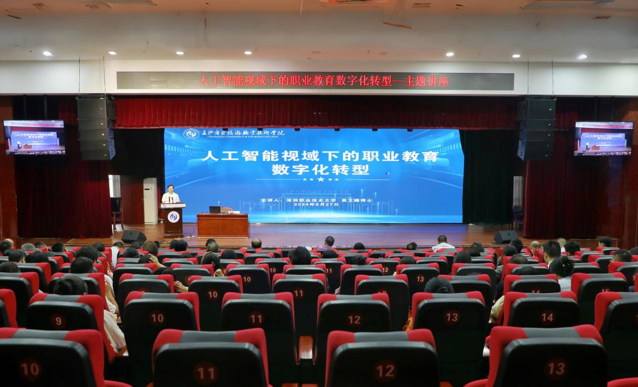 湖南教育新闻网讯 (通讯员 向瑾锦 范佳茵)乘“数”而上,赋“智”前行。6月27日,长沙商贸旅游职业技术学院特邀深圳职业技术大学吴文曦博士以“人工智能视域下的职业教育数字化转型”为题作专题讲座。500余名教职工现场聆听。