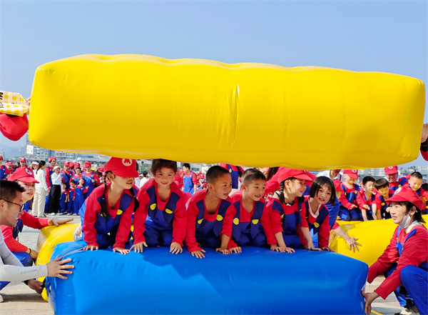 新晃思源实验学校小学部开展庆六一趣味运动会。活动项目包括摸石头过河,旋风跑,合力搭建等趣味活动,小学部全体师生积极参与,在赛场上拼搏奋斗,挥洒汗水,不仅加强了身体素质,也展现了学生与教师间的团队合作精神和拼搏竞争精神。(姚亚丽 供图)