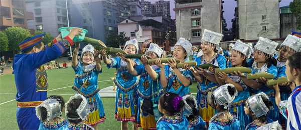 兴隆镇中心幼儿园在操场上开展一场别开生面的、以侗民俗文化为主题的庆“六一”亲子活动,幼儿及家长324人参加。活动集“吃、喝、玩、乐”于一体,有富有本民族特色的吃合拢宴、喝侗家“酒”、玩侗民俗游戏、穿侗族服饰、观看侗民俗特色的文艺展演等,小朋友、“大儿童”亲子同台,其乐融融。孩子们在玩玩乐乐中不仅认识和了解本土民俗文化,还激发孩子们爱家乡的情感。(田元春 供图)