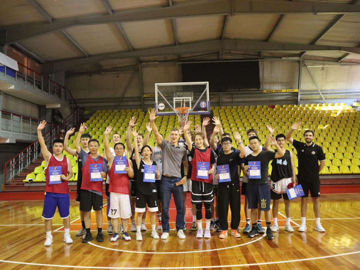 湘潭大学外国语学院邵正阳、王安一同学参加中俄青年篮球友谊赛,在球场上与萨拉托夫市青年篮球队切磋球技,挥洒汗水。